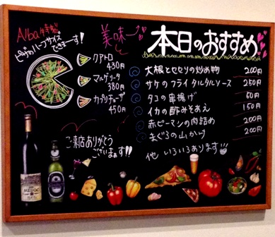 イタリア語で「日の出」を意味する「Alba(アルバ)」。JR倉敷駅から徒歩6分の日ノ出町にあります。家庭料理とおいしいお酒をたのしめるお店として、2013年10月25日にオープン!